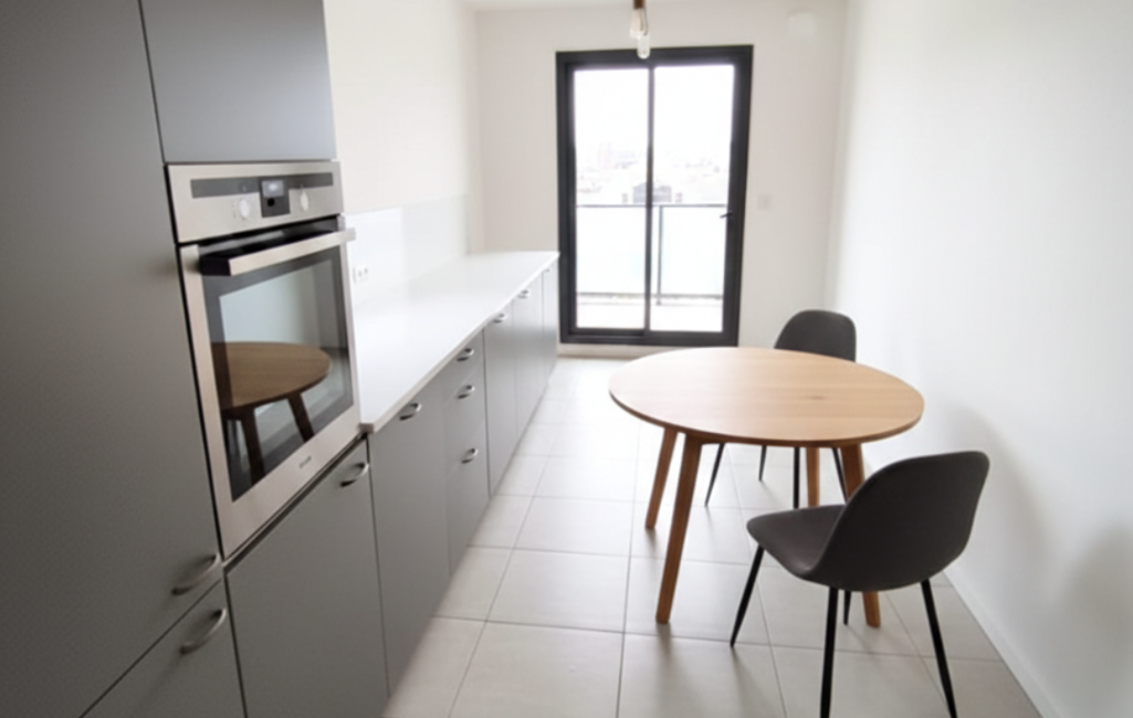 L’appartement se compose d’une entrée desservant un séjour salle à manger lumineux ainsi qu’une grande cuisine séparée aménagée et équipée. Ces espaces donnent accès à une loggia de 8 m² avec vue dégagée.