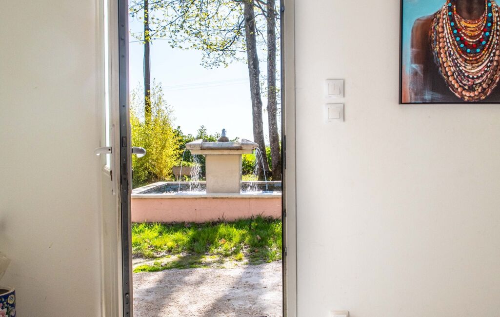 Le double séjour de 45m2 très lumineux avec ses larges baies vitrées avec volets roulants électriques ouvre sur un grand terrain paysager de 2500 m², avec un espace barbecue avec arrivée d’eau et d’électricité, et une belle fontaine, idéale pour profiter du cadre champêtre.