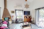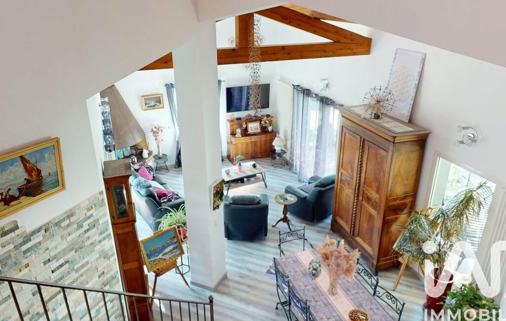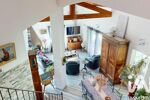 Elle s’ouvre sur une véranda faisant office d’entrée, menant à une vaste pièce de vie lumineuse avec séjour, salle à manger et cuisine ouverte. Le volume est mis en valeur par un plafond cathédral, une mezzanine dominante et des poutres apparentes.