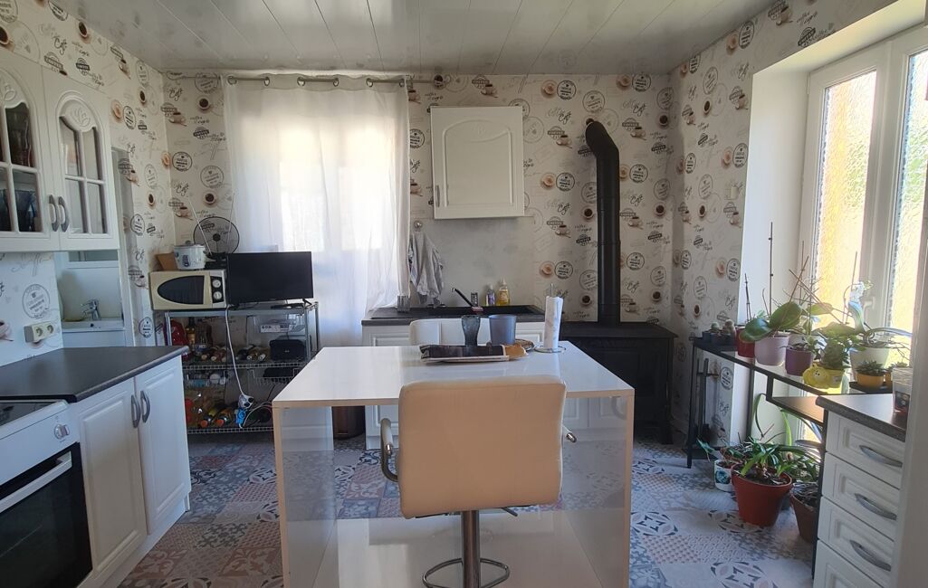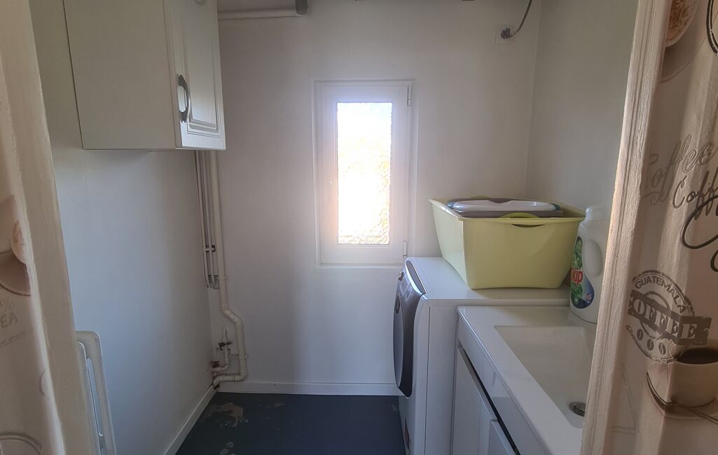 Cette maison de plain-pied se compose d'une entrée desservant l'ensemble des pièces. À gauche un salon, à droite une salle à manger. Deux chambres, dont une avec accès à la salle de bain, un WC indépendant, une cuisine séparée avec poêle à bois ventilé, ainsi qu'une buanderie.