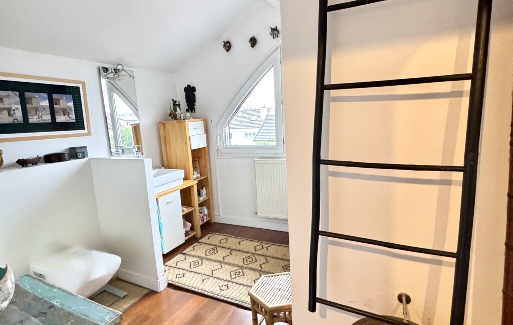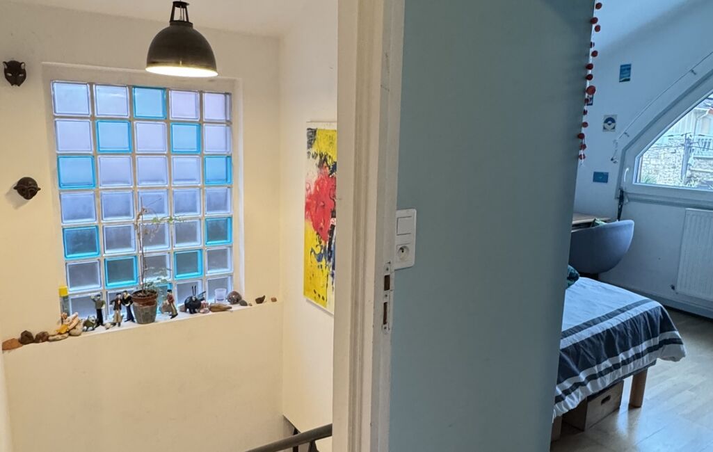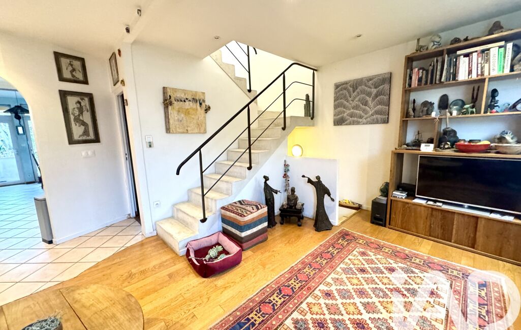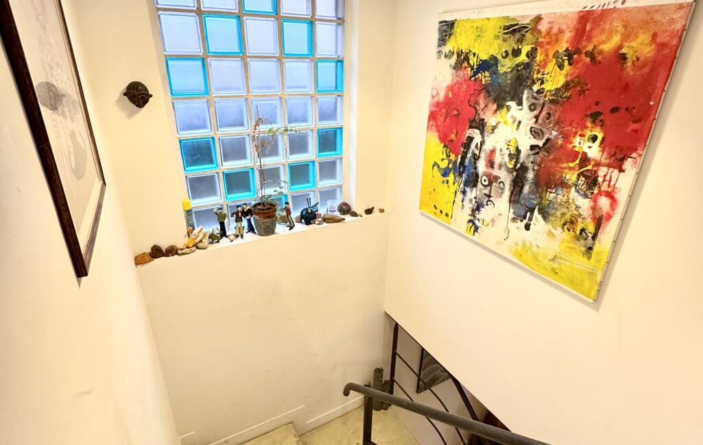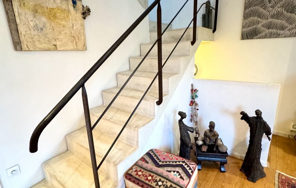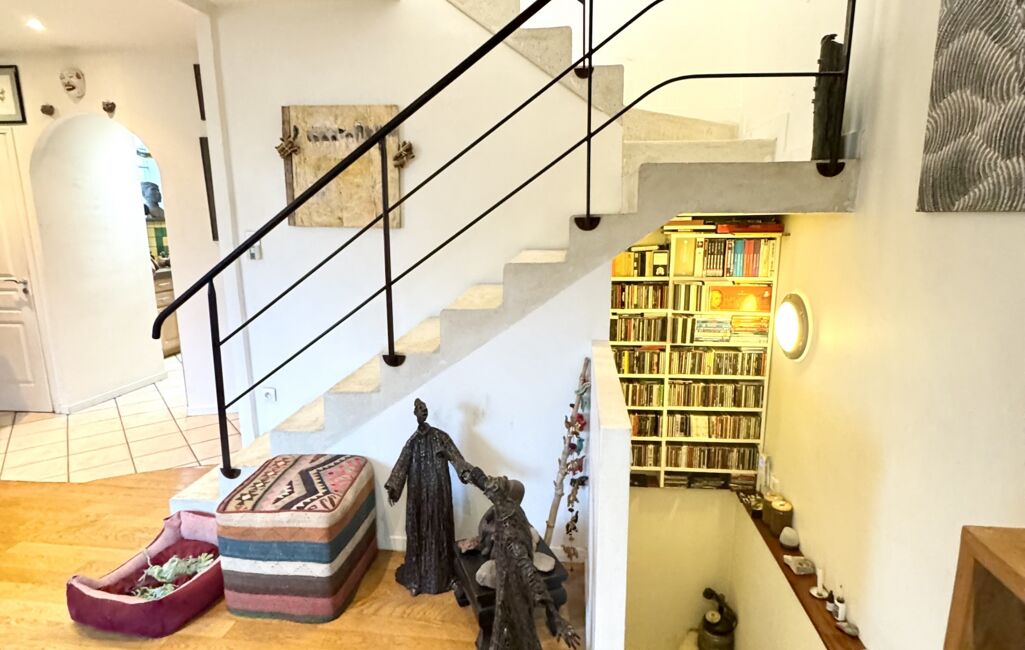 Dès l’entrée, un sas accueillant mène à un beau séjour lumineux, entouré de verdure, sublimé par un superbe escalier d’architecte qui donne immédiatement le ton : une maison au caractère unique, esprit atelier d’artiste.