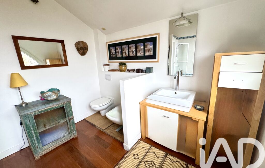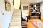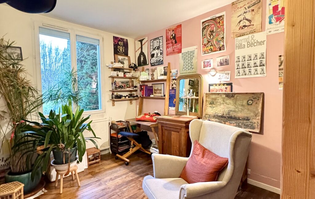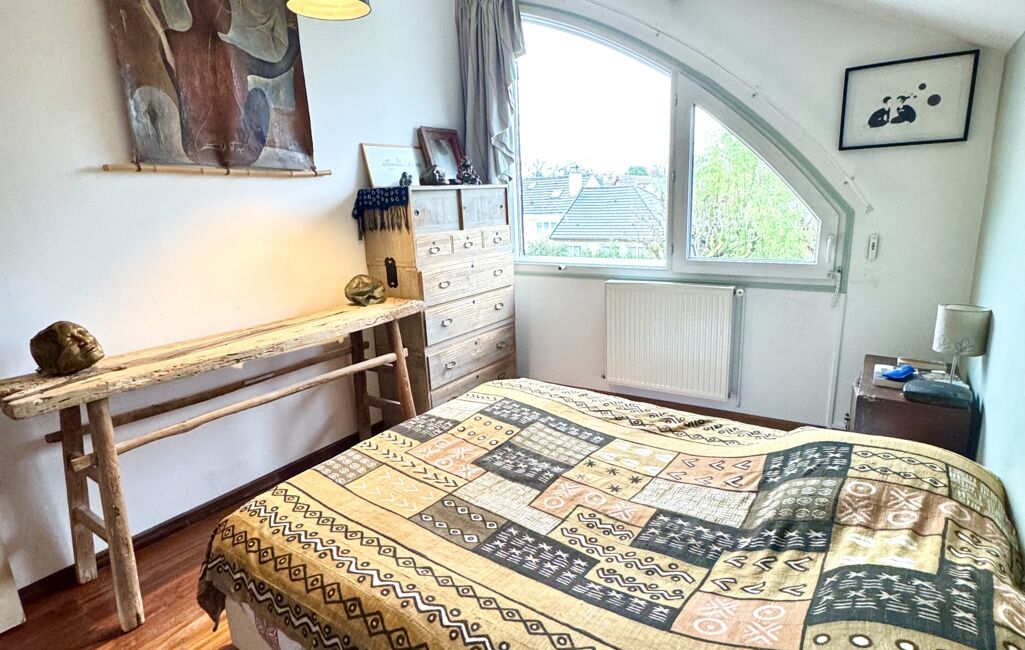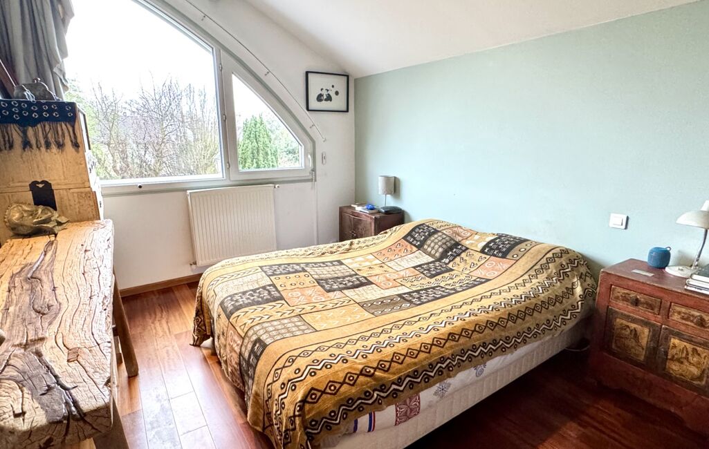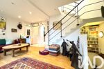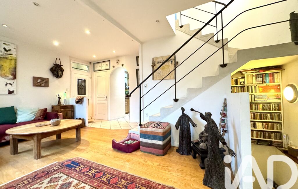 Dès l’entrée, un sas accueillant mène à un beau séjour lumineux, entouré de verdure, sublimé par un superbe escalier d’architecte qui donne immédiatement le ton : une maison au caractère unique, esprit atelier d’artiste.