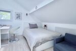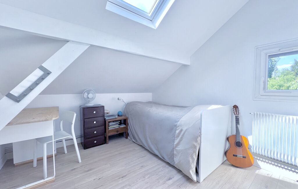 À l'étage se trouvent trois chambres et une salle de bains avec wc. Le rez-de-jardin est composé de deux chambres bénéficiant d'un accès direct indépendant sur le jardin, d'un garage (second emplacement de parking en extérieur), d'une buanderie, d'une chaufferie, d'une salle d'eau avec wc, d'un cabinet de toilette avec wc et d'un bureau.