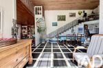 Le bel escalier en pierre et fer forgé ainsi que le carrelage viennent ajouter un cachet supplémentaire à cette pièce exceptionnelle, tandis que le poêle à pellets apporte une note confortable.
