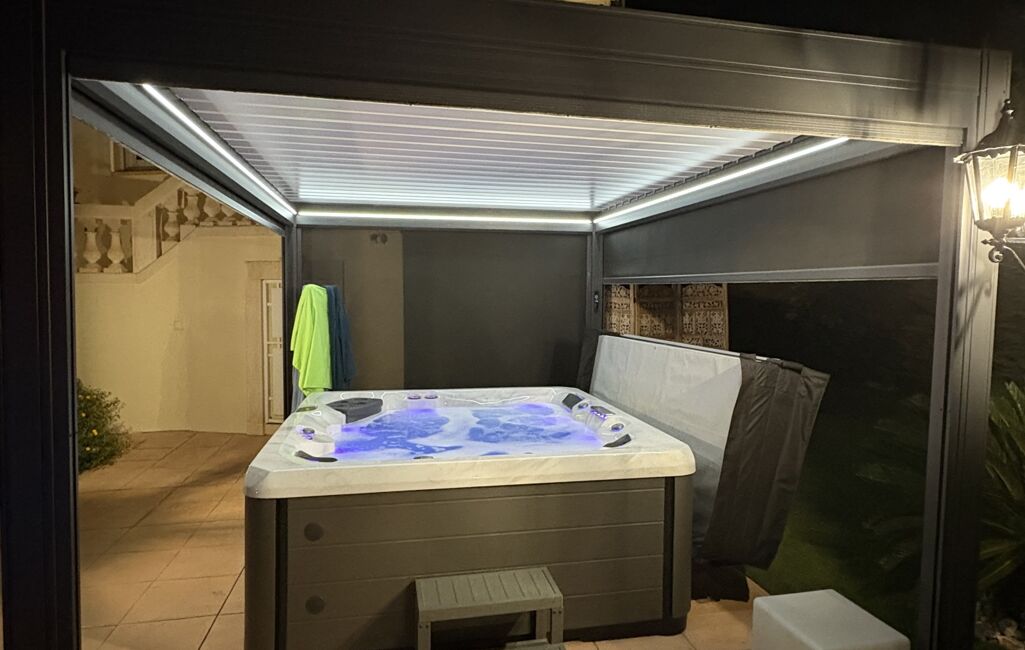 Piscine chauffée de 12x6 avec volet de protection , spa avec pergola bioclimatique