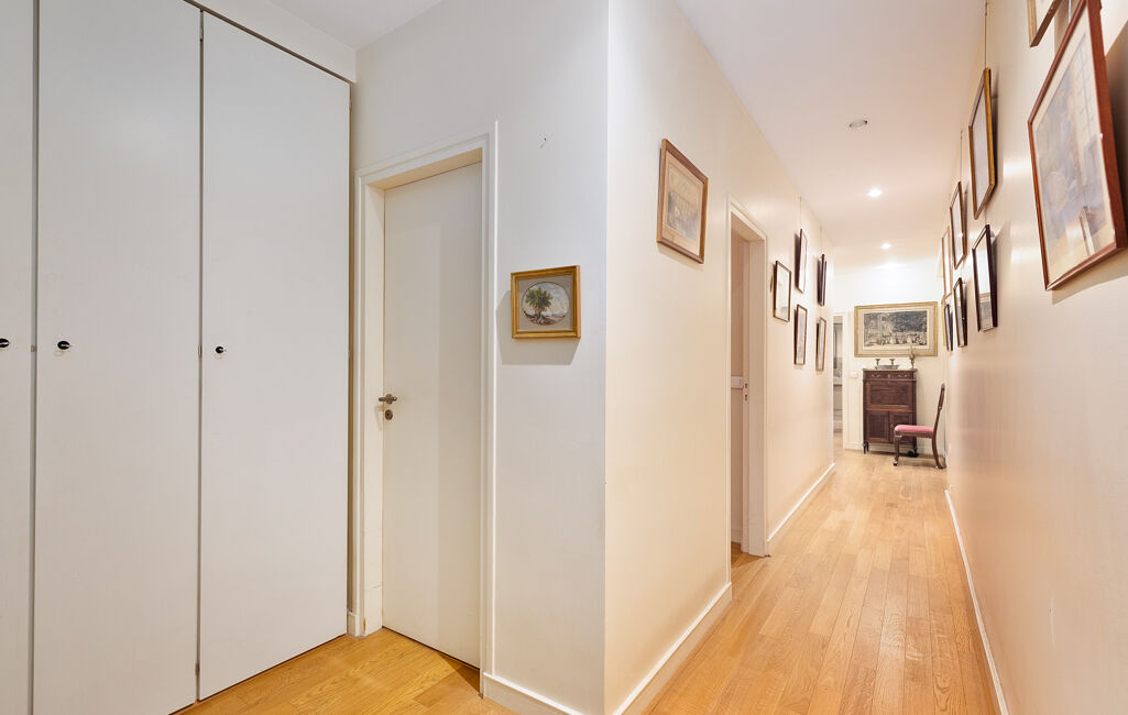 L'appartement s'ouvre sur une élégante galerie d'entrée menant à une triple réception de 68 m² avec cheminée, idéal pour recevoir. Sur cour, une spacieuse cuisine dînatoire avec entrée de service offre un confort de vie rare dans le quartier.