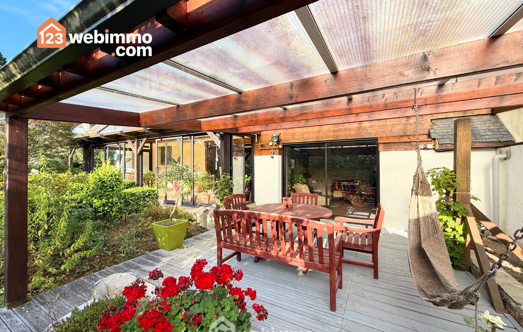 À l'extérieur, le terrain paysager de 855 m², entièrement clos, invite à la détente grâce à ses arbres fruitiers et son abri de jardin de 8 m². Un environnement calme et verdoyant, propice au repos comme aux activités de plein air.