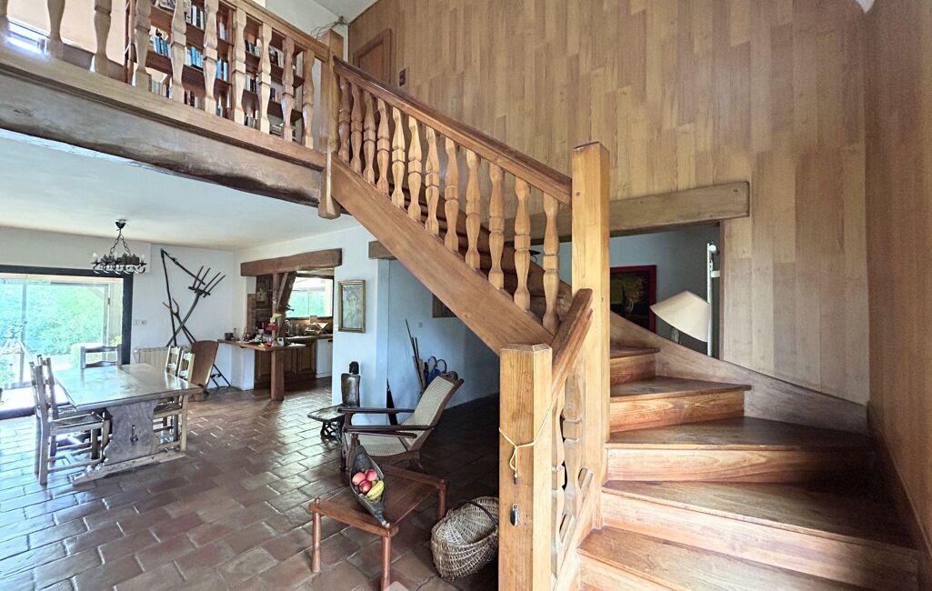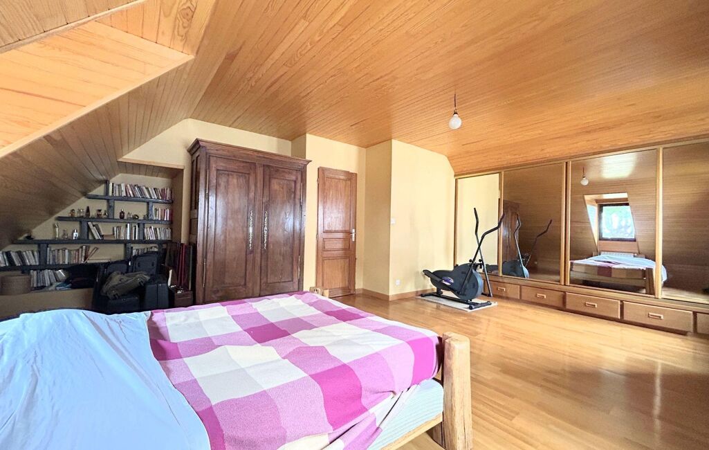 À l'étage, le palier aménagé en mezzanine dessert deux grandes chambres de 13 m² et 23 m² habitables, une très spacieuse salle de bains et un WC séparé, idéal pour recevoir famille et petits-enfants en toute indépendance.