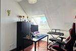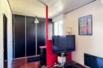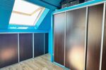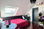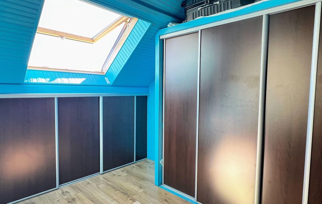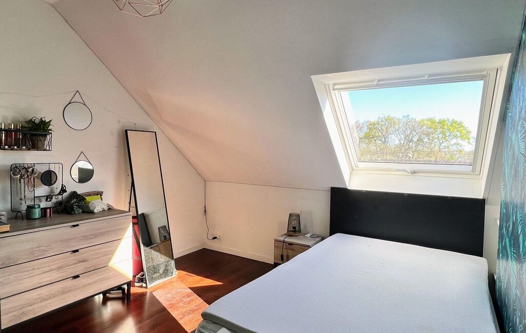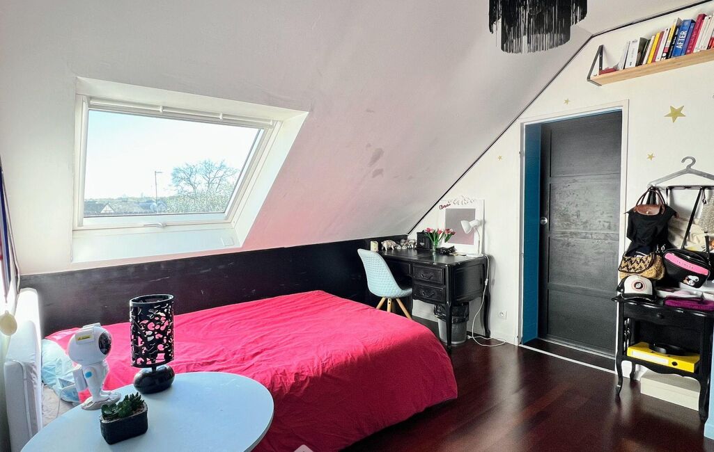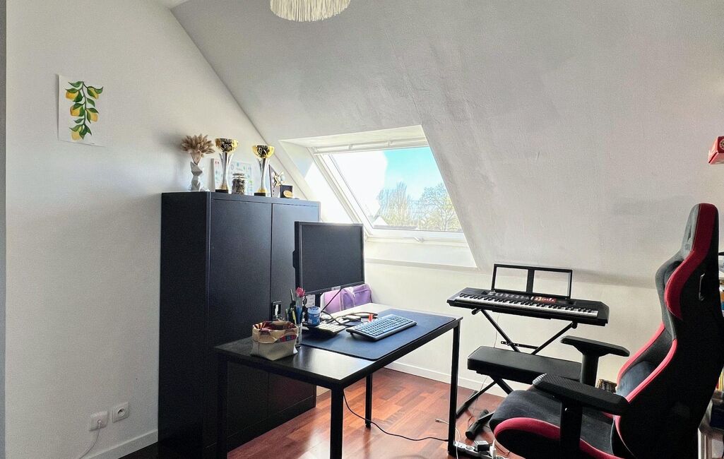À l'étage, une mezzanine spacieuse et lumineuse offre un bel espace bureau et distribue deux chambres lumineuses, un bureau sous mansarde et une salle de douche commune.