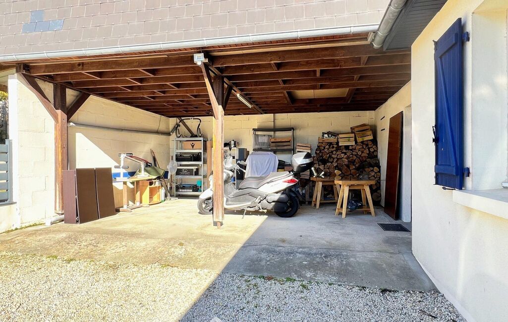 Un préau permet également de stationner deux véhicules et donne accès à une dépendances très pratique pour le rangement et le stockage.