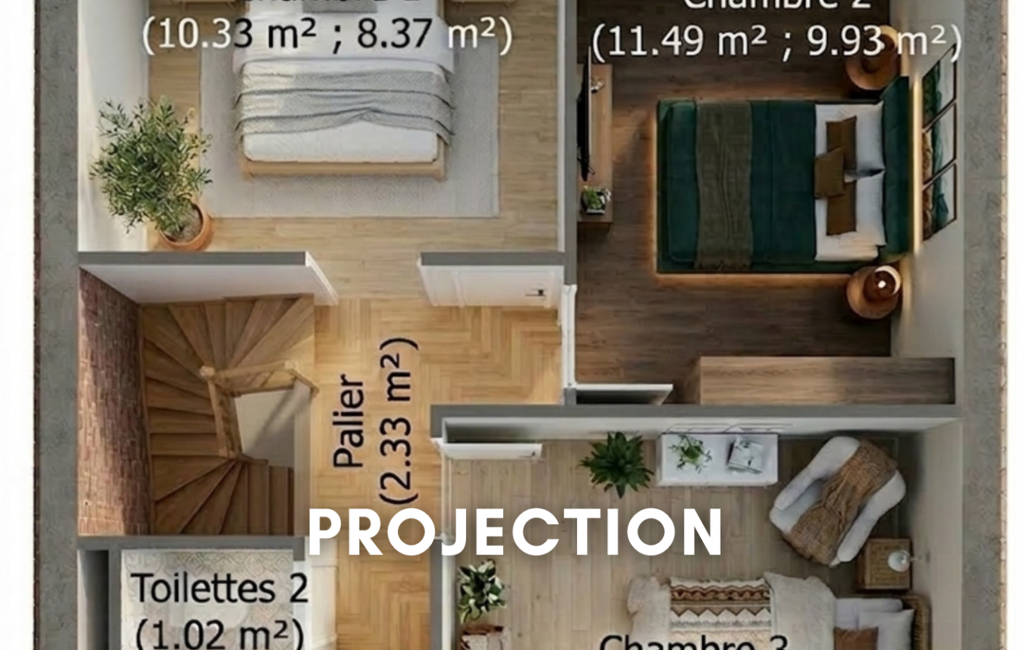 À l’étage, le palier dessert trois chambres, une salle d’eau et un second WC indépendant.