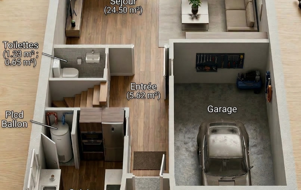 La visite débute par une entrée desservant une cuisine indépendante de plus de 8 m² ainsi qu’un lumineux séjour d’environ 24 m² ouvrant de plain-pied sur le jardin clos et arboré avec sa terrasse. Vous bénéficiez également d’un WC indépendant et d’un garage intégré d’environ 17 m² avec accès direct depuis la maison.