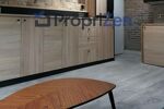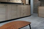 Le coin cuisine, moderne et fonctionnel, est équipé d'un réfrigérateur-congélateur, d'une plaque de cuisson et d'une hotte aspirante. Des emplacements spécifiques ont été prévus pour l'installation d'une machine à laver le linge et d'un four micro-ondes, facilitant ainsi l'aménagement et l'organisation quotidienne. Cet espace a été pensé pour optimiser la préparation des repas dans un environnement compact mais complet.