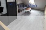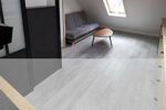 La salle de douche, également entièrement rénovée, est dotée d'un receveur de douche spacieux de 90x70 cm, d'un meuble vasque élégant, et d'un WC. Elle bénéficie d'une fenêtre, assurant une ventilation naturelle et une belle luminosité. Deux armoires de rangement et des étagères complètent cet espace, offrant des solutions pratiques pour organiser les affaires de toilette. L'ensemble est conçu pour allier confort et praticité.