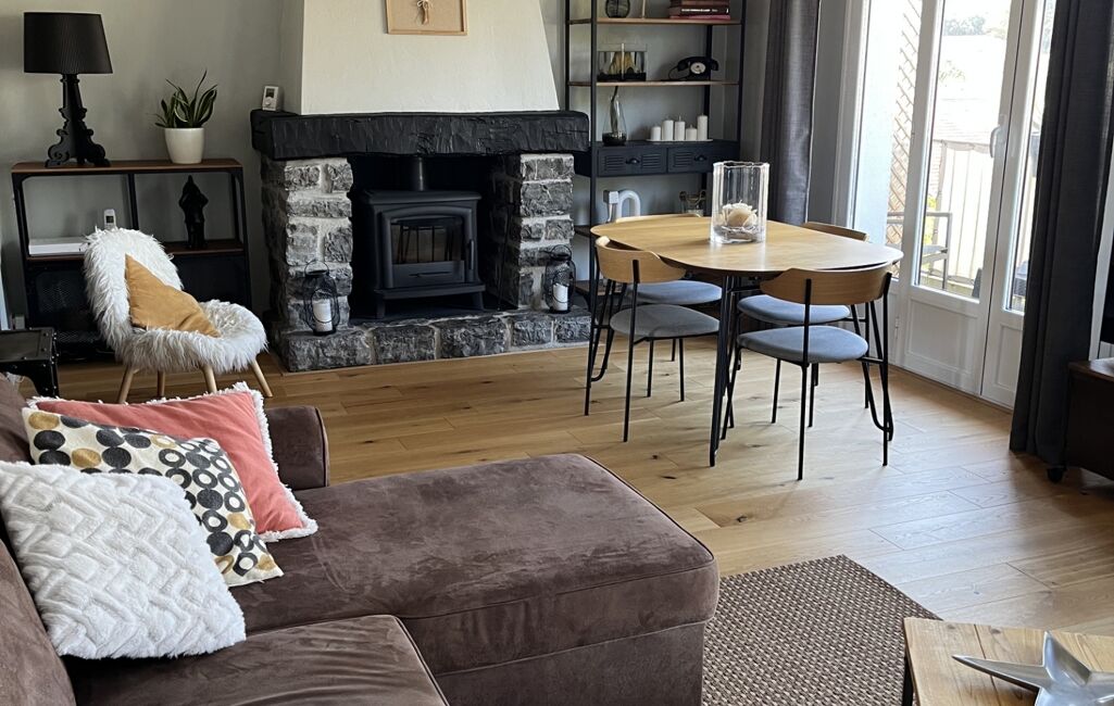 * Vaste séjour (28 m²) très lumineux exposé plein sud, avec poêle à bois. Vue dégagée sans vis-à-vis avec terrasse de 16 m² très agréable orientée Sud et Ouest, accessible par les baies vitrées du séjour et d’une chambre.