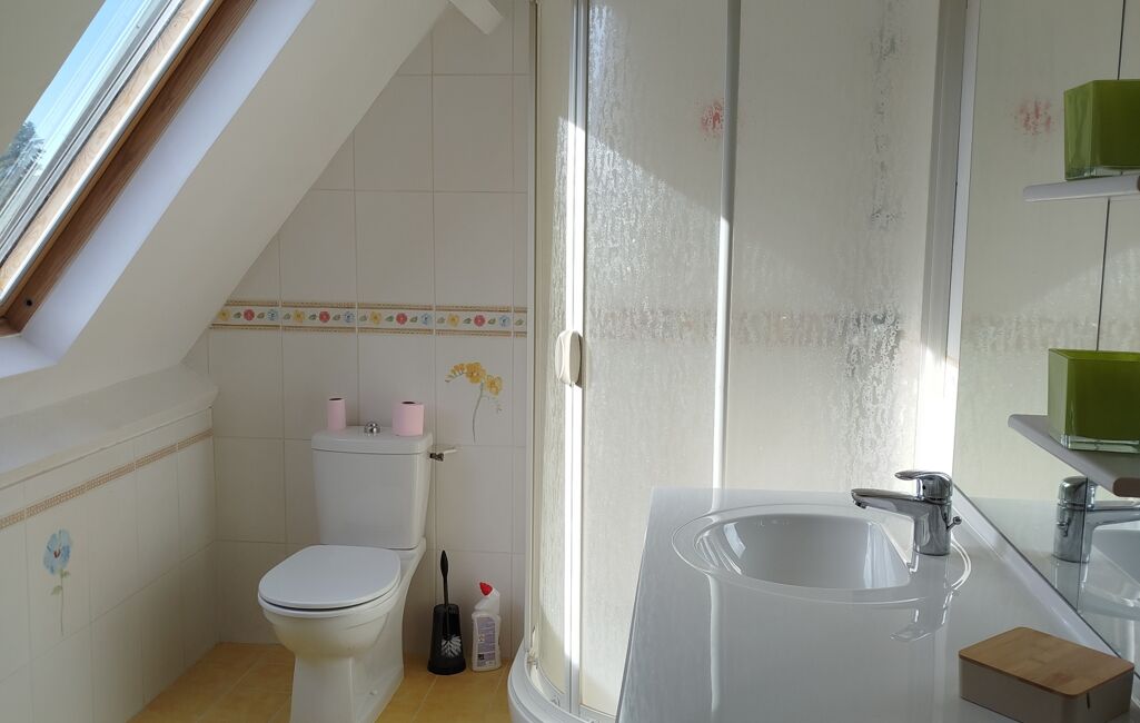 À l’étage, un palier dessert deux chambres supplémentaires ainsi qu’une seconde salle d’eau avec WC, offrant une organisation fonctionnelle pour une famille ou pour recevoir.