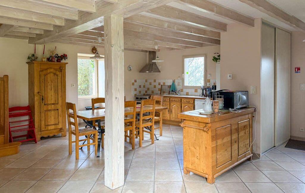 À la suite de cet ensemble, une salle commune de 90 m², entièrement rénovée, comprend une cuisine de 16 m², une salle principale de 59 m², des sanitaires et une pièce de stockage. Cet espace se prête naturellement à l'accueil de repas de groupes, de rencontres familiales ou d'événements ponctuels.