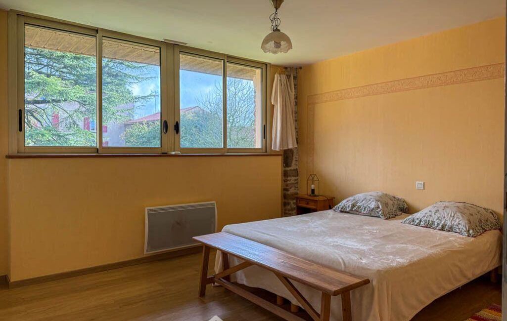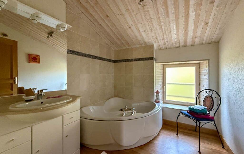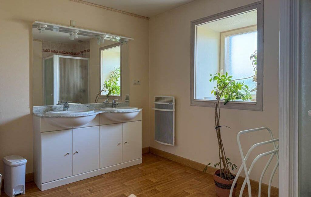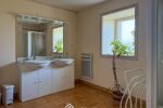 À l'étage, la maison offre quatre chambres, dont une avec salle de bains et WC privatifs, une seconde avec salle d'eau, ainsi qu'une salle d'eau indépendante équipée d'un WC sanibroyeur. Les travaux de création d'une cinquième chambre avec salle d'eau ont été commencés et restent à achever.