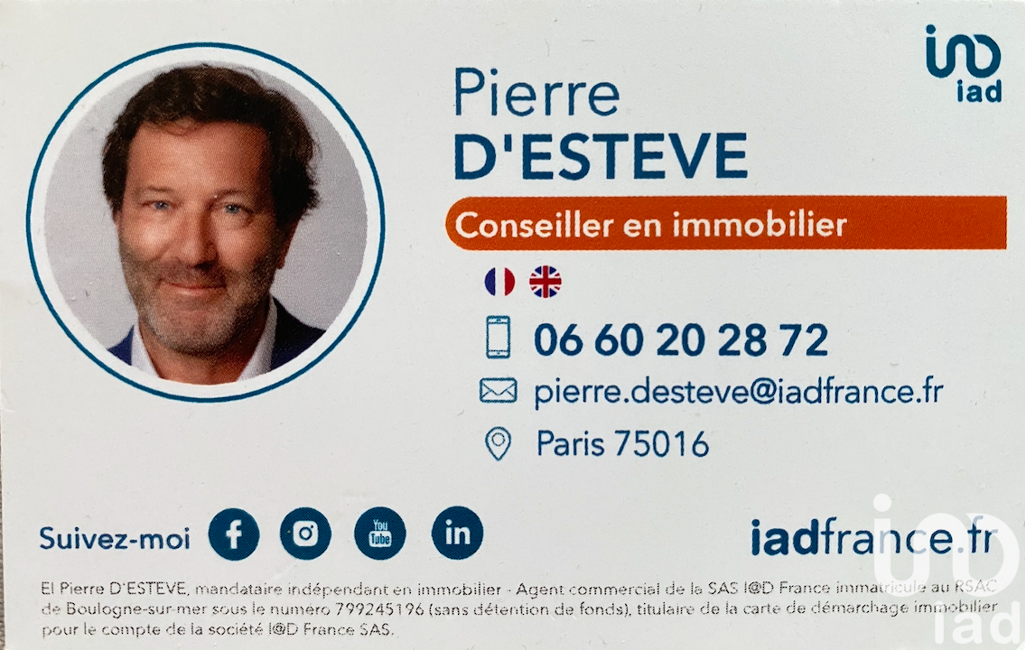 La présente annonce immobilière a été rédigée sous la responsabilité éditoriale de M Pierre D'estève mandataire indépendant en immobilier (sans détention de fonds), agent commercial de la SAS I@D France immatriculé au RSAC de Boulogne-sur-Mer sous le numéro 799245196, titulaire de la carte de démarchage immobilier pour le compte de la société I@D France SAS.