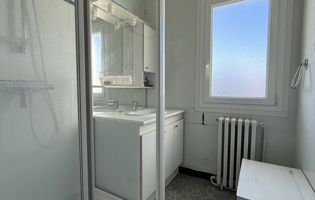 L’entrée dessert la cuisine ainsi que le séjour. Au demi-niveau supérieur se trouvent deux chambres, une salle d’eau et un WC séparé.