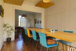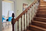 Accès au rdc à la salle de réunion, salle de détente, à la cuisine, aux sanitaires et salle de bain.