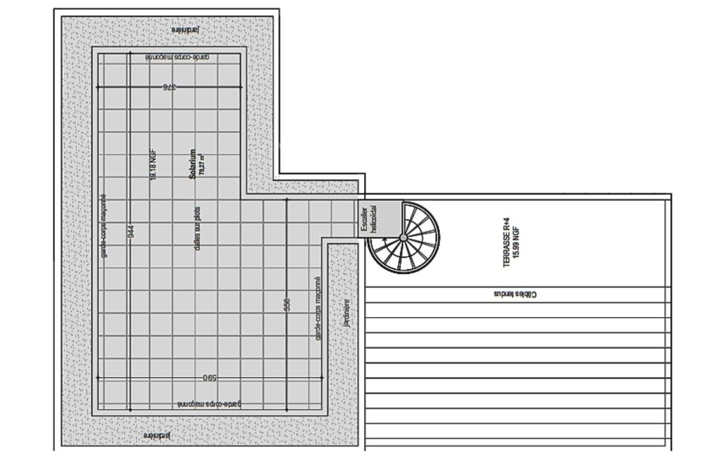 Situé au 4 ème et dernier étage, cet appartement T5 de 117 m² environ habitables se prolonge par une terrasse de 52 m² environ et un solarium en rooftop de 80 m² environ.