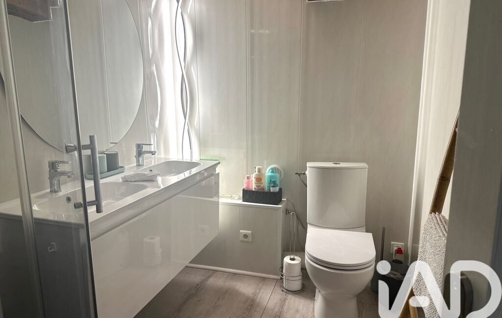 A l'étage : un palier dessert 2 grandes chambres (plus de 20m2) équipées de nombreux placards de rangement, ainsi qu'une salle de douche avec double vasques et WC.