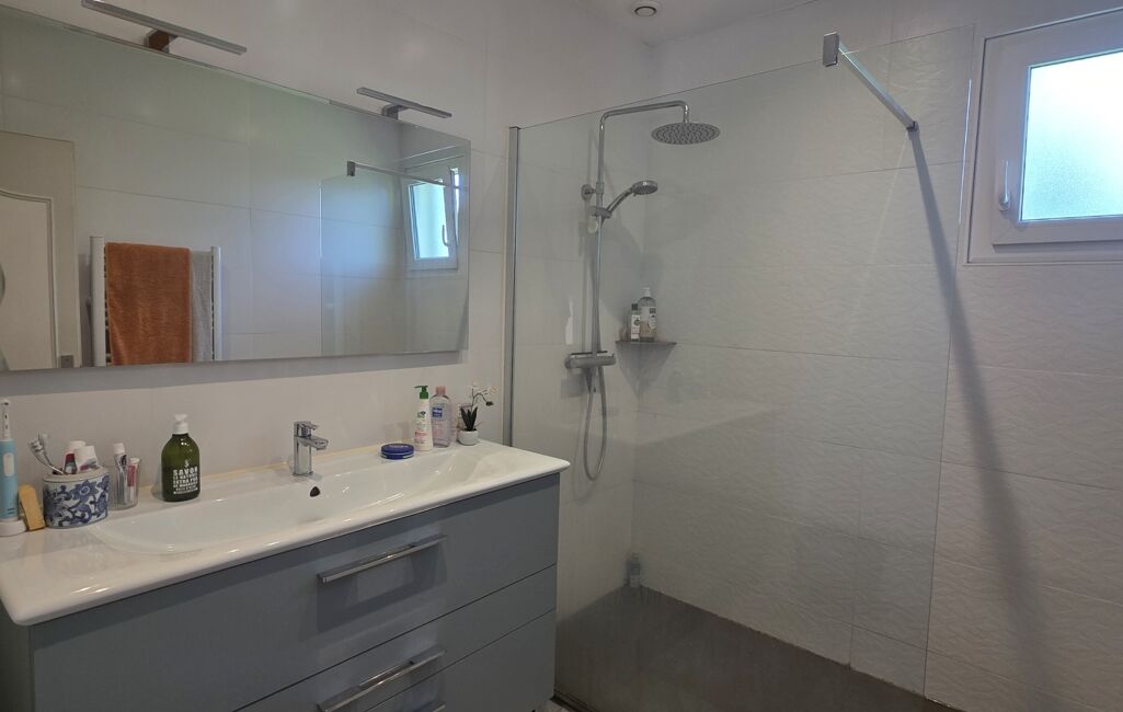 La maison bénéficie de prestations de qualité avec des menuiseries récentes équipées de volets roulants solaires et de moustiquaires intégrées, d’un chauffage électrique et d’un chauffe-eau thermodynamique.