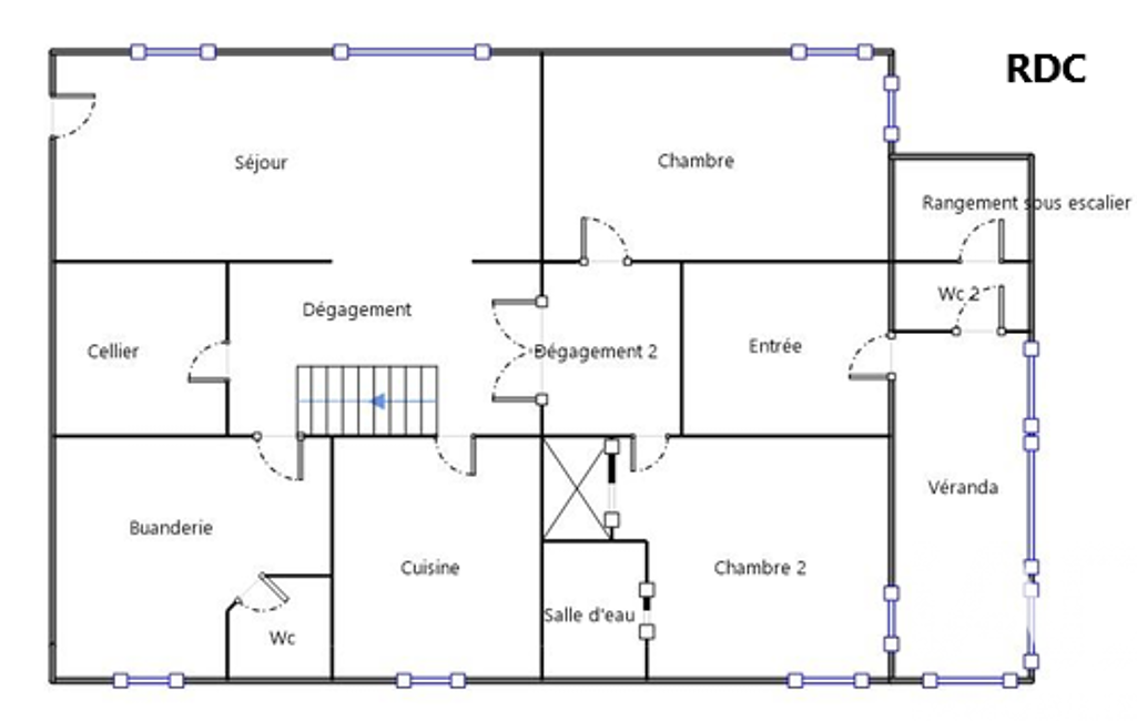 • Rez-de-chaussée : 5 pièces principales, dont un séjour, une cuisine, deux chambres, une véranda, une buanderie et un cellier.