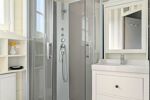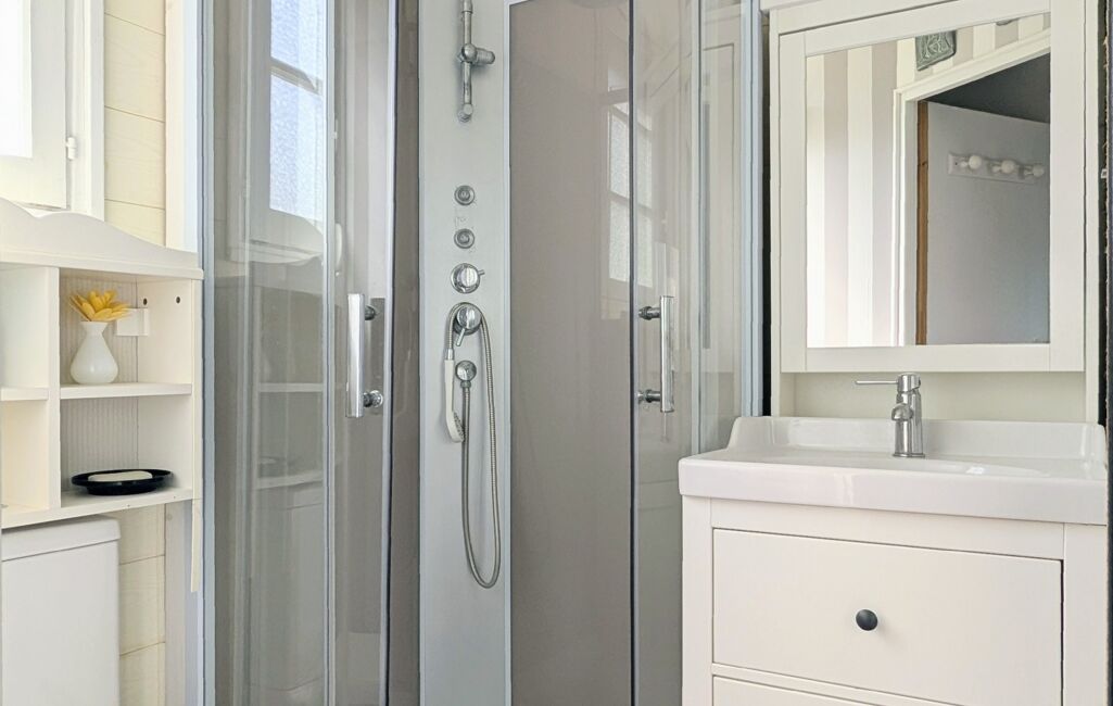 Le rez-de-chaussée, qui dispose de nombreux espaces de rangement, se compose d'une salle à manger donnant à la fois sur la terrasse et sur une cuisine ouverte entièrement équipée et aménagée, d'un salon cosy, d'une chambre parfaite pour les enfants ou les amis et d'une salle d'eau avec w.c.