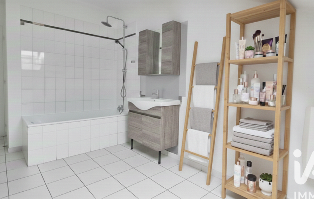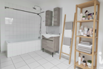 Salle de bain : Moderne avec baignoire, meuble vasque et espace buanderie.