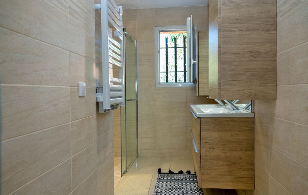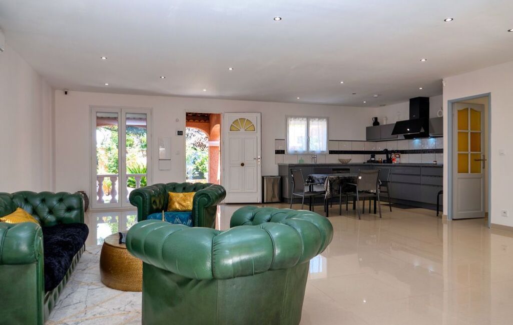Cette maison, entièrement rénovée, offre un confort moderne, une cuisine équipée neuve, de grands volumes, la climatisation réversible, des volets roulants électriques, un système d'alarme récent, et des places de stationnement.