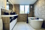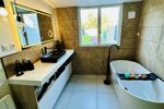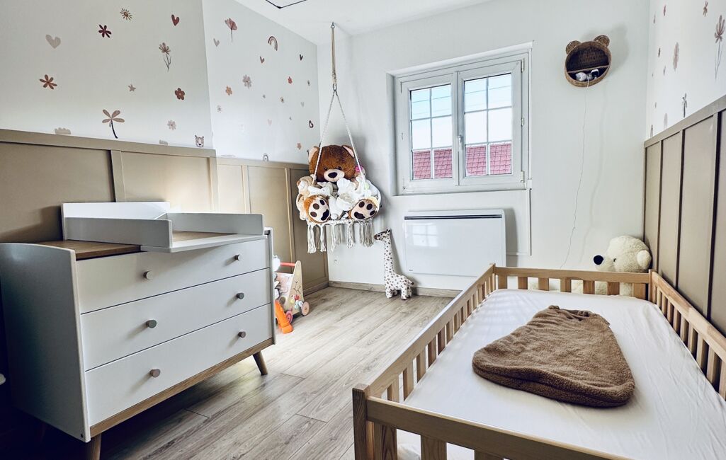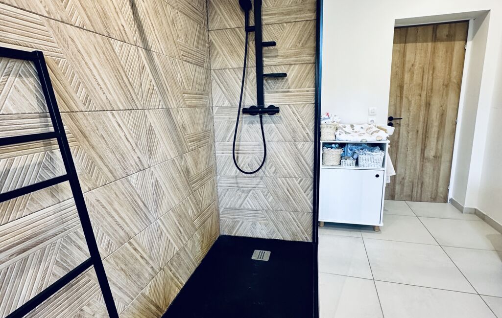 Elle se compose d’un salon séjour , une cuisine équipée , une buanderie , une salle de bain ( en bas ) , wc , 3 chambres , une grande pièce ( jeux , bureau , 4 ème chambre ou autres ) , un jardin .