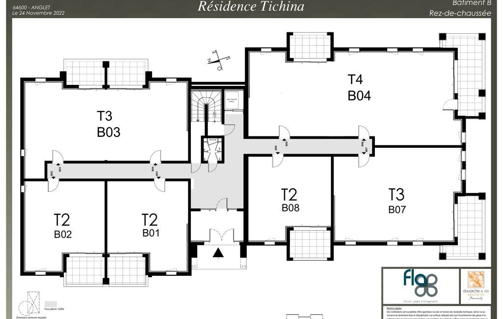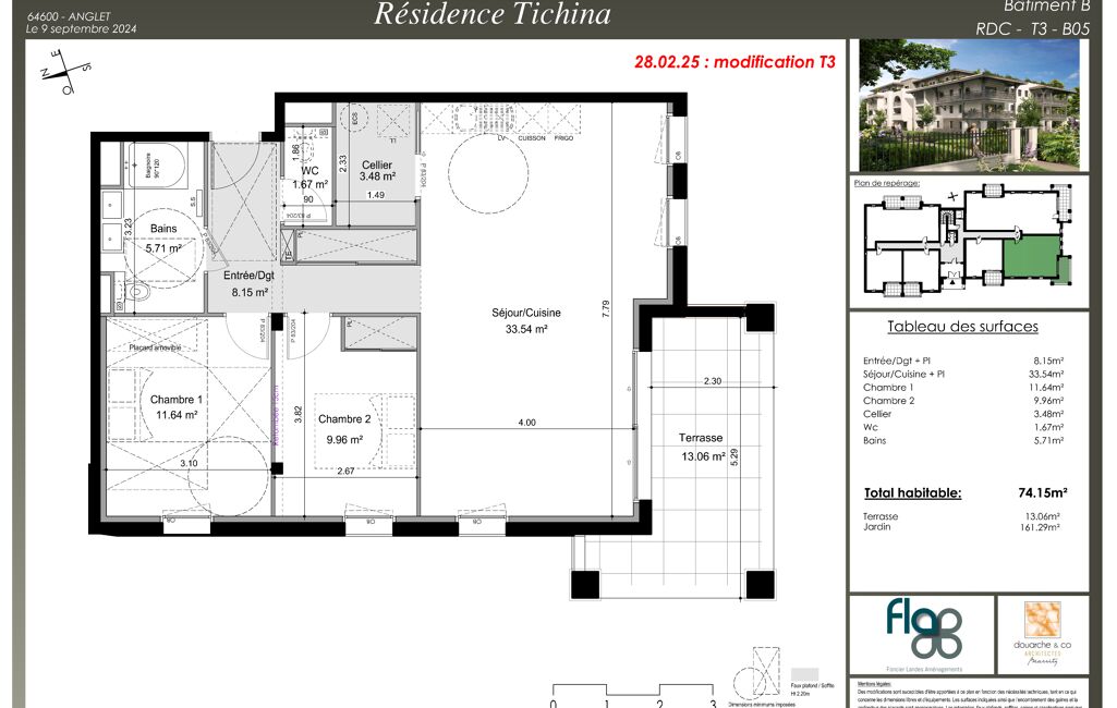 Dans une résidence neuve de très haut standing au centre-ville d’Anglet. Superbe appartement 3 pièces de 74.15 m² au rez-de-chaussée exposé Sud et Ouest avec une terrasse et un jardin privatif de 161.29 m².Très calme. Rare ! Possibilité d’acquérir un parking.