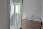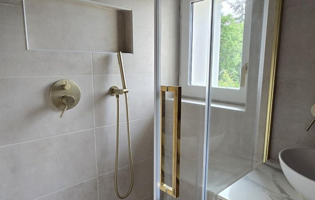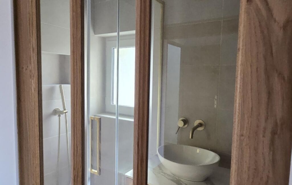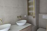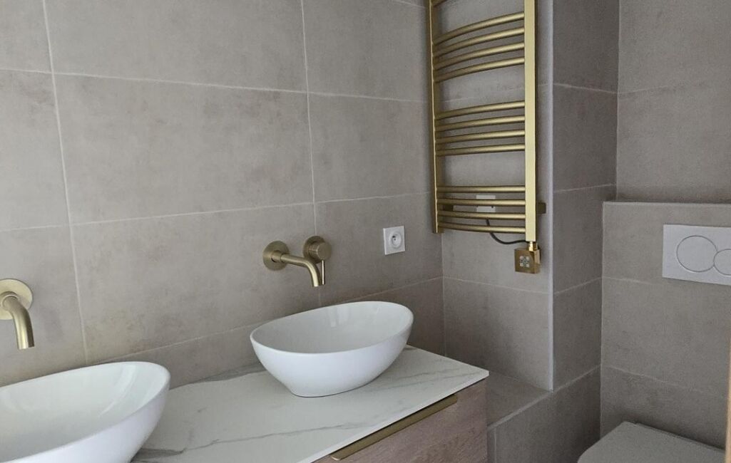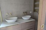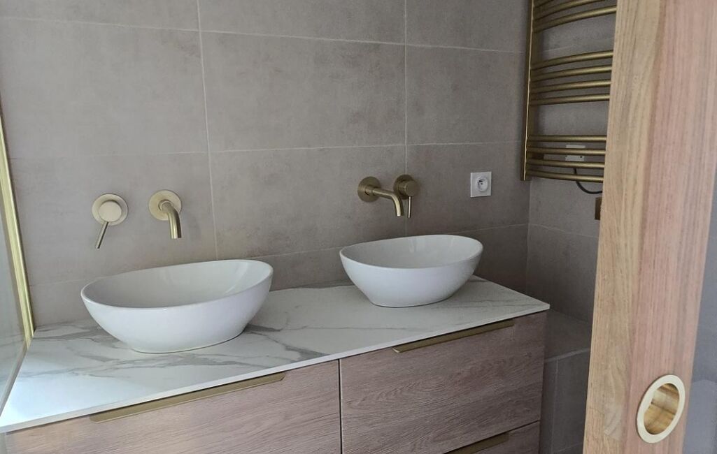 Toutes les prestations au sol sont en travertin et parquet chêne massif et tous les matériaux sont haut de gamme.