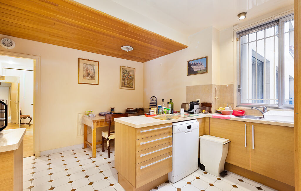 L'appartement s'ouvre sur une élégante galerie d'entrée menant à une triple réception de 68 m² avec cheminée, idéal pour recevoir. Sur cour, une spacieuse cuisine dînatoire avec entrée de service offre un confort de vie rare dans le quartier.