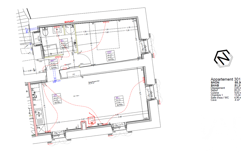 L’immeuble se compose de cinq appartements de type 2, tous actuellement loués, avec des surfaces comprises entre 50 et 57 m².