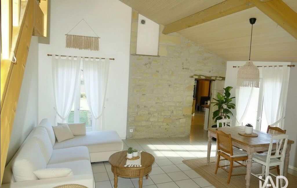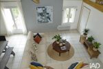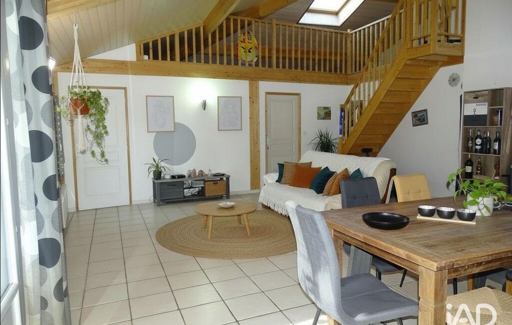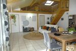 La pièce de vie séduit par son beau volume, sa hauteur sous plafond, sa mezzanine pouvant servir de bureau, et son mur en pierre apparente qui apporte beaucoup de cachet. Une baie vitrée permet un accès direct vers la terrasse.