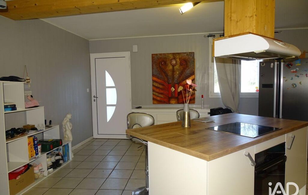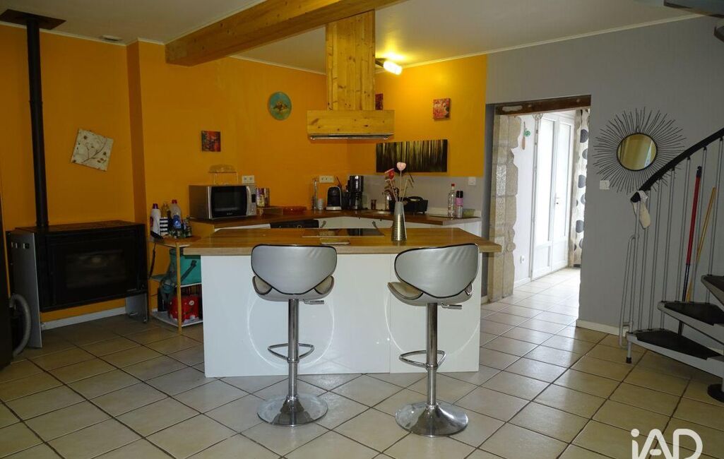 L’accès principal se fait par la cuisine aménagée et équipée, une configuration typique des maisons anciennes, pratique au quotidien. On y trouve également un poêle à granulés qui participe au confort thermique de la maison et crée une atmosphère chaleureuse.