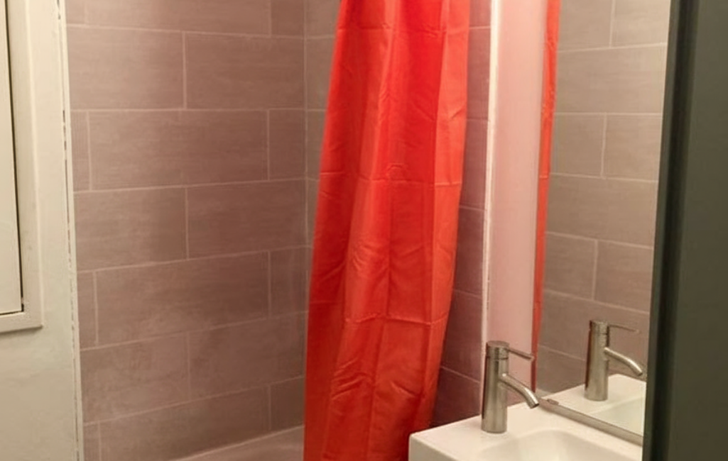 La salle de bain moderne est équipée d'une douche, d'un meuble vasque Ikea avec des rangements pratiques et d'un grand miroir, alliant esthétisme et fonctionnalité. Le chauffage à basse consommation assure un confort thermique optimal tout en maîtrisant les dépenses énergétiques.