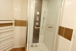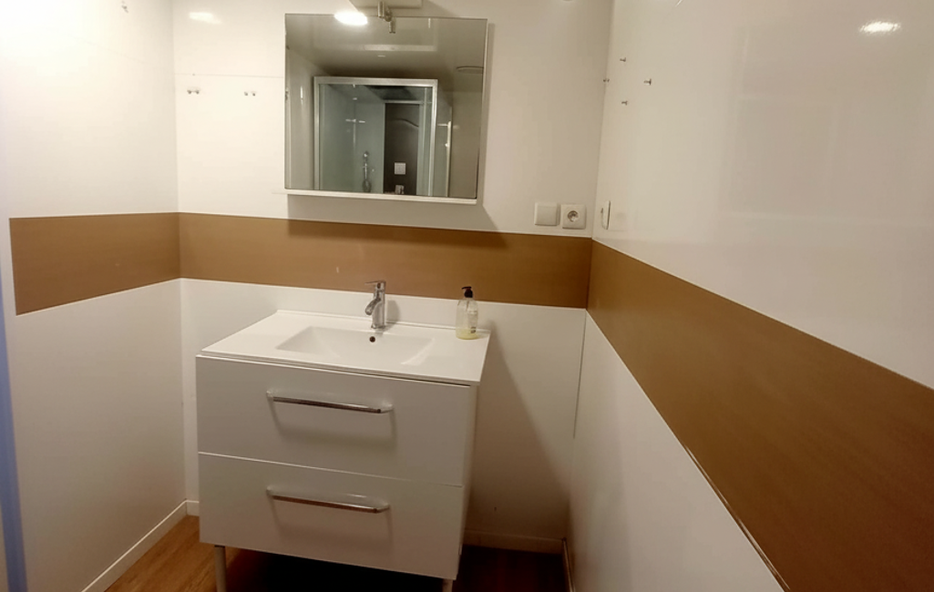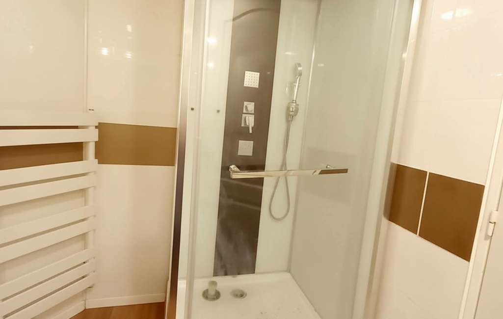 Une entrée sur bel ensemble salon/salle à manger, une grande cuisine aménagée, une charmante salle de douches avec son meuble vasque et miroir, WC.