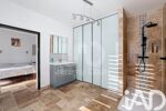 La suite parentale au RDC de 28m² est un véritable cocon de confort, avec son carrelage en travertin et son WC japonais, tout en étant entièrement adaptée PMR.