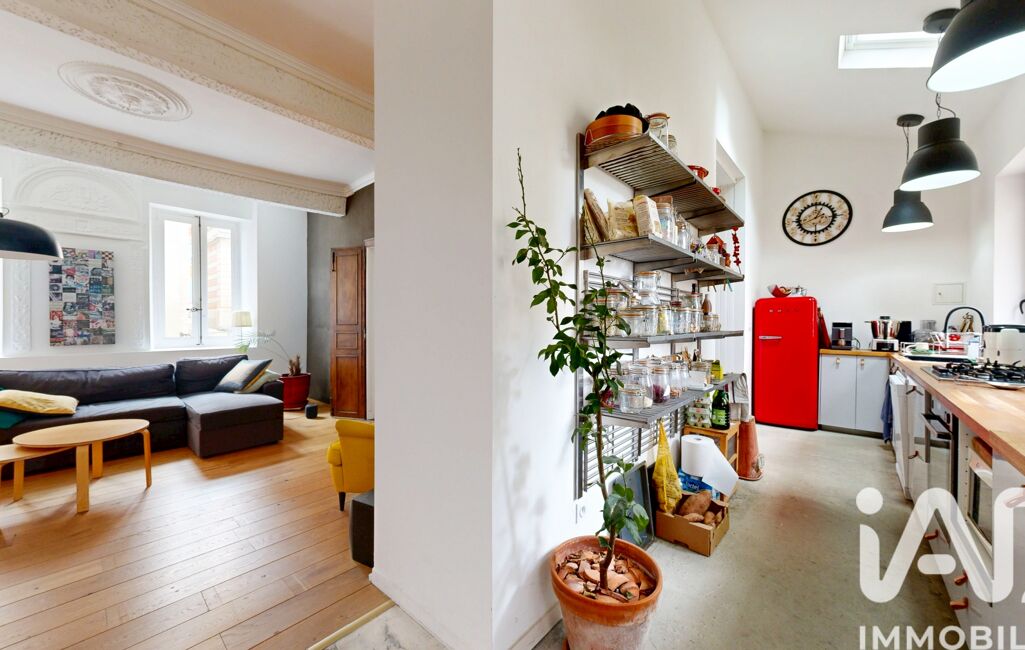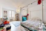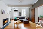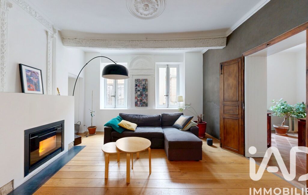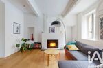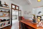 Le salon dévoile un cachet remarquable avec ses poutres apparentes, ses élégantes moulures et ses murs enduits en terre crue, créant une atmosphère authentique et raffinée.