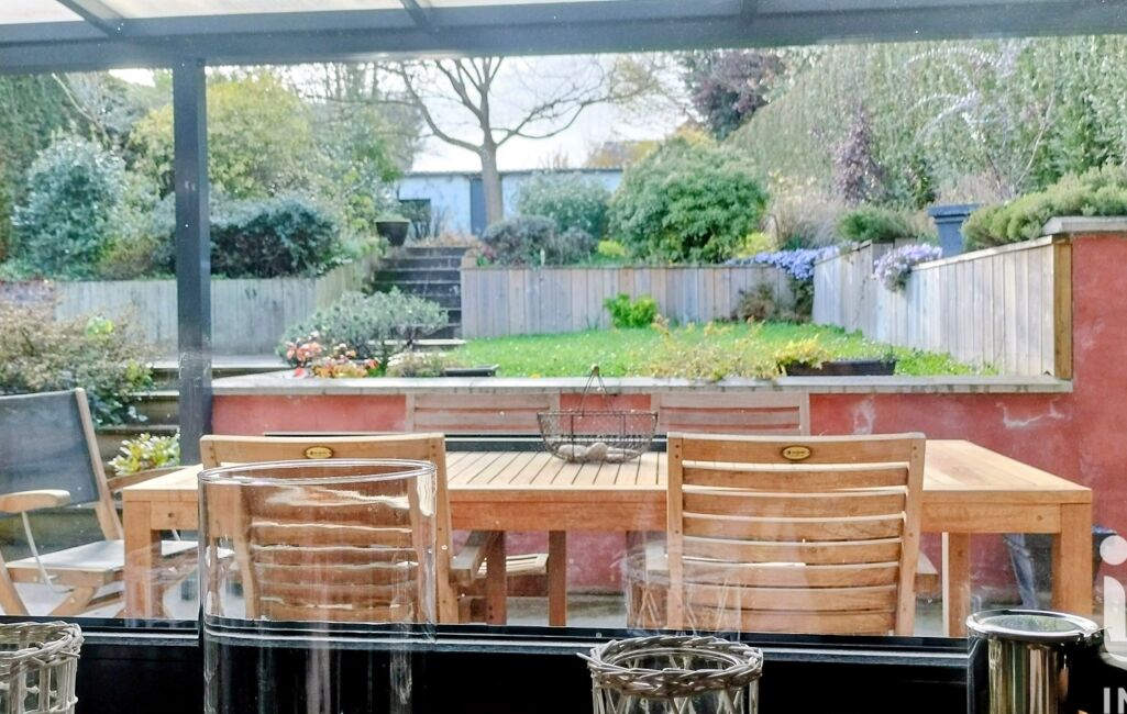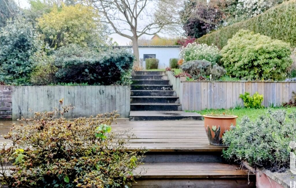 Terrasse et pergola, jardin , grand garage, 3 places de parking, passage latéral piéton.