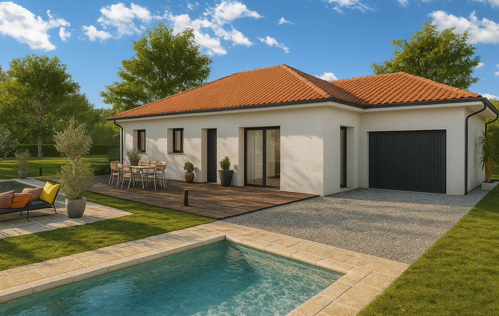 Une maison de 100m² comprenant 3 chambres spacieuses, un espace de vie lumineux et fonctionnel, des WC séparés, une salle de bain moderne et personnalisable et la possibilité de faire un garage de 20m².