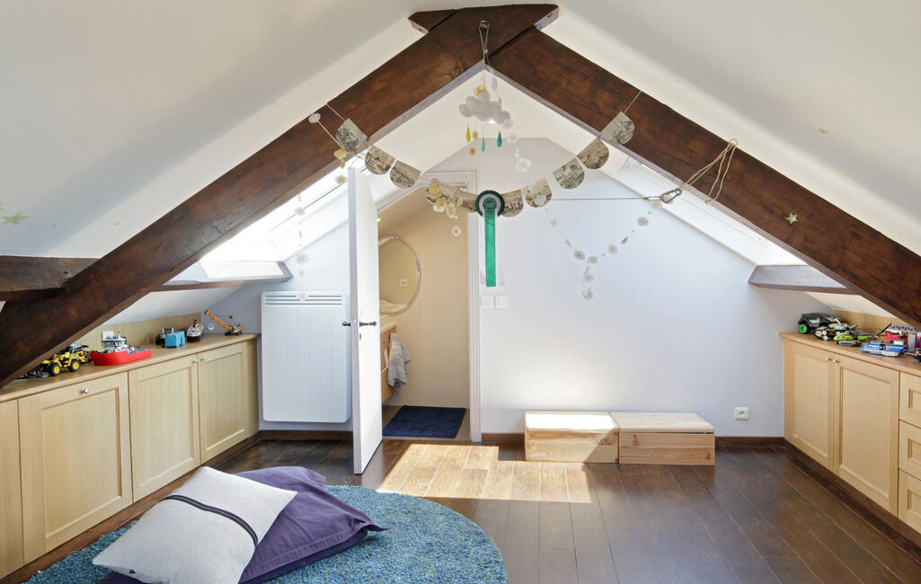 Qu'une salle de bain et des WC séparés. Le dernier niveau, mansardé, abrite deux