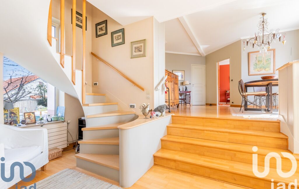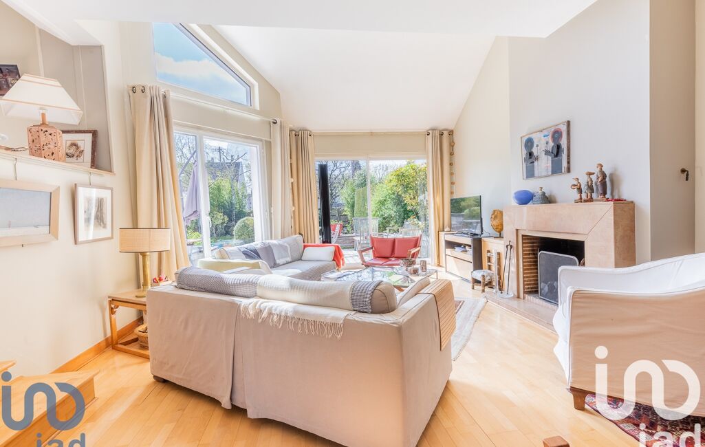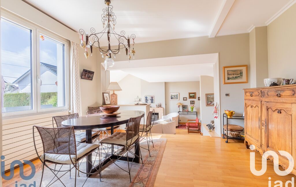 La pièce de vie d'une surface de 47m2 s'articule autour d'une grande salle à manger, attenante à une cuisine moderne de 9m2, aménagée et équipée, récemment rénovée. Quelques marches plus bas, vous serez séduits par le coin salon baigné de lumière, sublimé par un plafond cathédrale et une élégante cheminée. L'atmosphère y est chaleureuse et raffinée. Une grande baie vitrée s'ouvre sur une terrasse exposée au sud et vous permet de profiter été comme hiver de la lumière et de la vue sur le jardin arboré très bien entretenu.