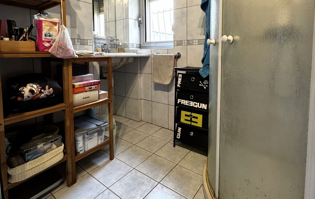 Elle est composée au rez : d'un salon - salle à manger, une cuisine séparée, un buanderie, une salle de douche, un WC et un accès à la cave.