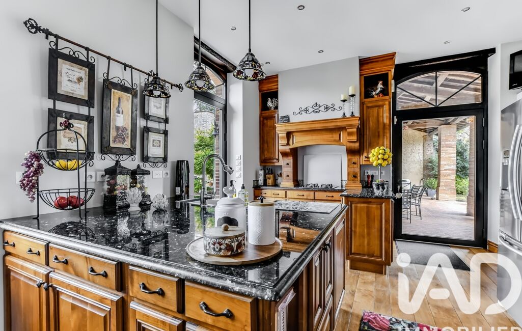 - Une cuisine sur mesure en merisier massif et granit, aménagée et équipée, donnant accès à deux terrasses et au jardin.