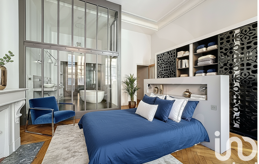 Côté cour, au calme, se déploie l’espace nuit composé de deux belles chambres avec chacune sa salle d’eau, ainsi qu’une suite parentale de près de 40 m², avec un dressing fait sur mesure et une salle de bain avec verrière très réussie.